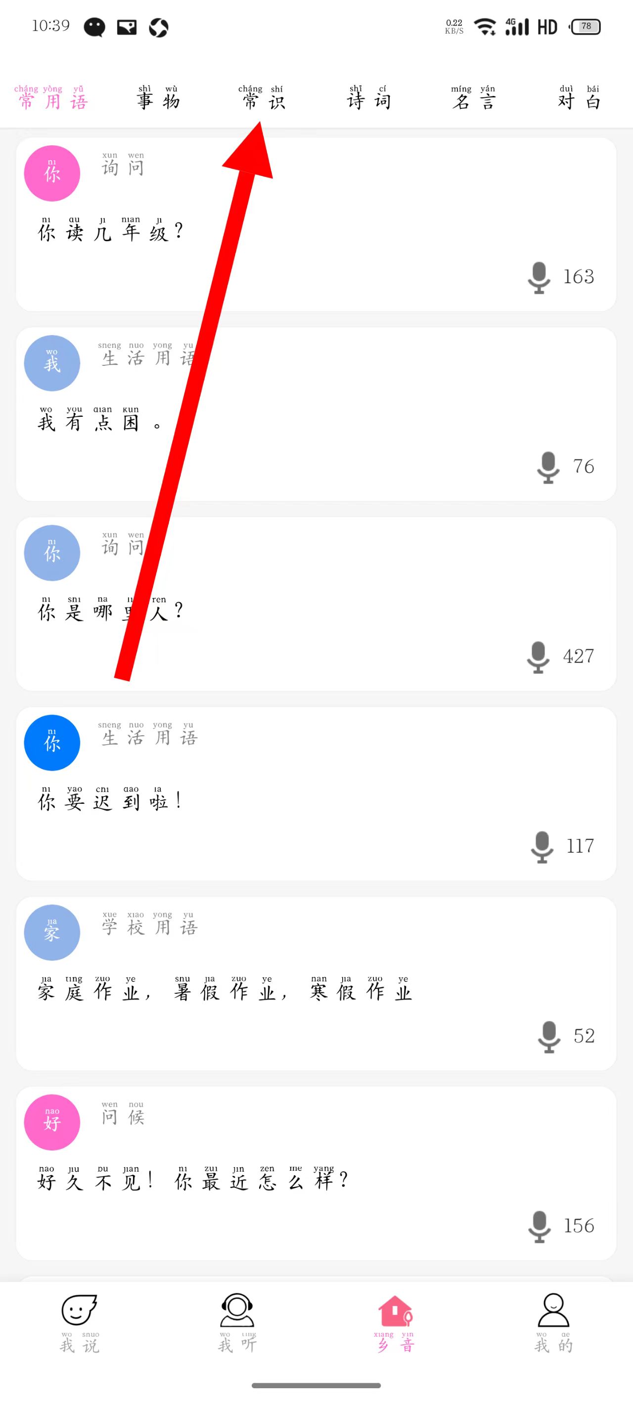 2、在鄉(xiāng)音界面上方,找到常識選項,點擊進(jìn)入常識分類界面。