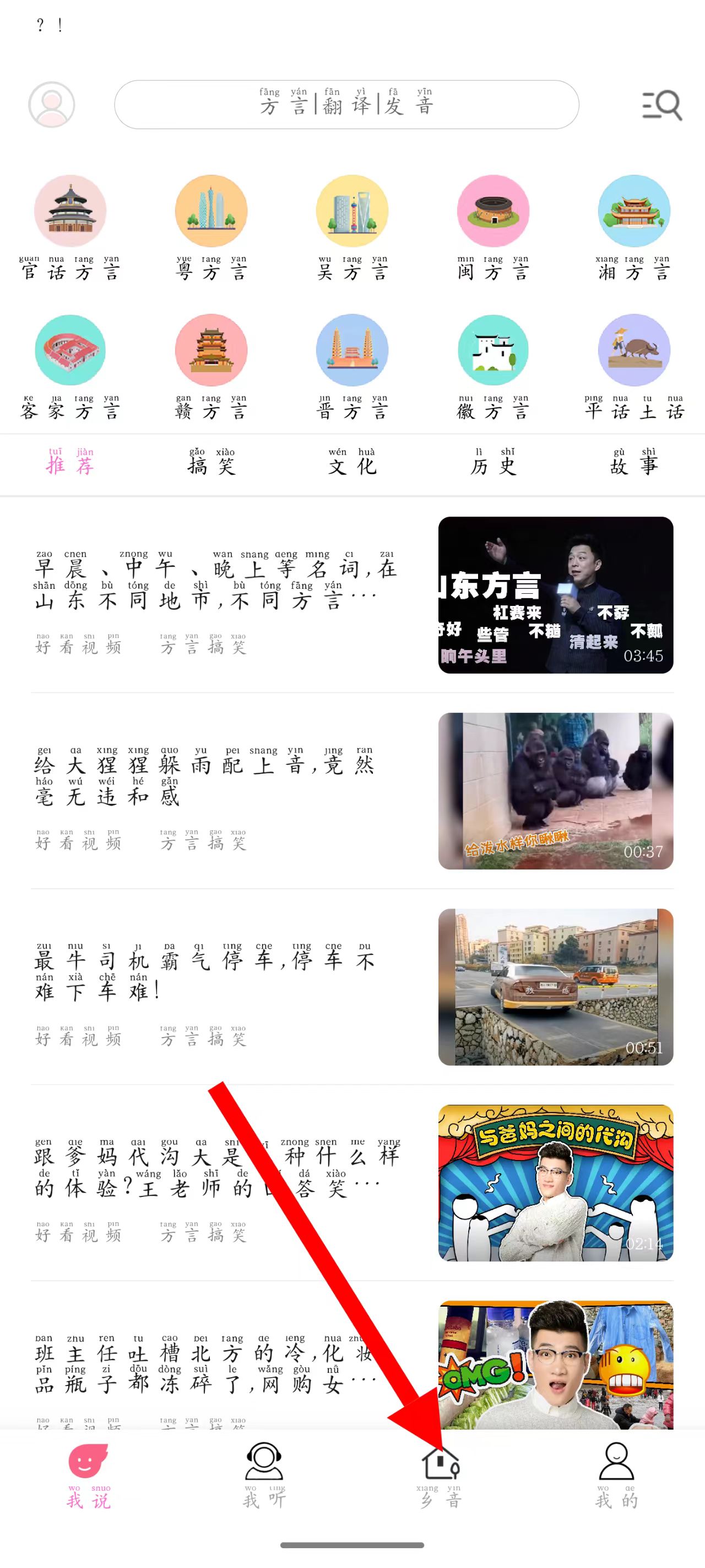 1、打開方言學(xué)習(xí)類app,點擊底部導(dǎo)航欄的鄉(xiāng)音進(jìn)入對應(yīng)界面。