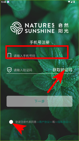 2、在注冊界面,輸入手機(jī)號碼并點(diǎn)擊獲取驗(yàn)證碼,同時(shí)勾選同意協(xié)議。