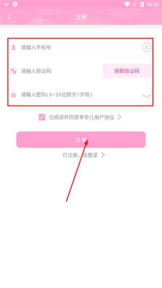 2、在注冊(cè)頁(yè)面,輸入手機(jī)號(hào),輸入驗(yàn)證碼,再設(shè)置密碼,勾選用戶協(xié)議,點(diǎn)擊注冊(cè)按鈕。