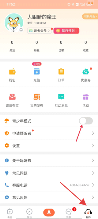 1、打開(kāi)嗎嗎答APP,點(diǎn)擊底部我的選項(xiàng),進(jìn)入個(gè)人中心頁(yè)面。