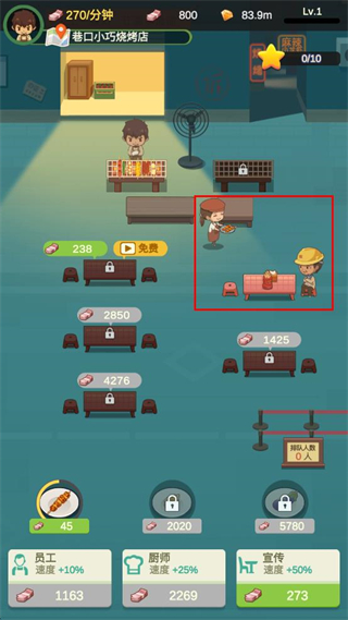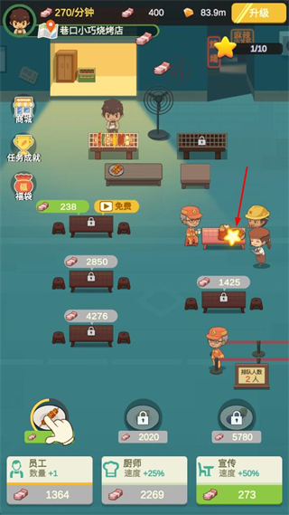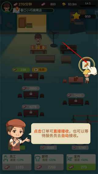 單操作,輕松寫意:通過點擊升級來獲得更多色味俱佳的烤品,升級服務(wù)員和廚師的等級,滿足食客們的口腹之欲。