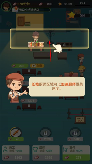 2、長按廚師所在區(qū)域,加速廚師的做菜速度,提升餐品制作的效率。