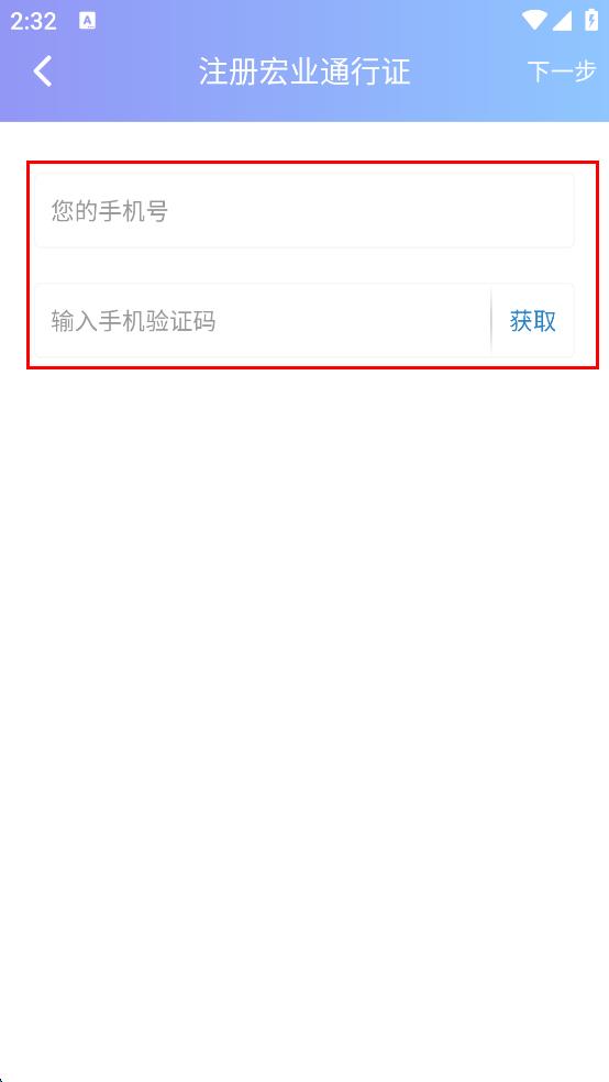 3、在注冊(cè)頁(yè)面,輸入手機(jī)號(hào),獲取并輸入驗(yàn)證碼,點(diǎn)擊下一步。