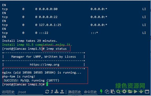 10.實(shí)在不放心使用lnmp status查看lnmp運(yùn)行狀態(tài),如圖都正常都在運(yùn)行