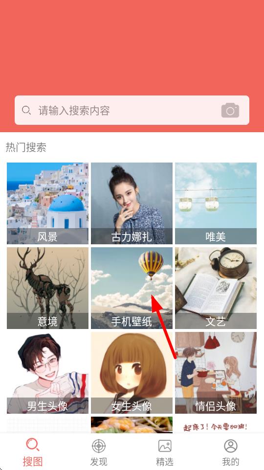 1、打開(kāi)圖片大全搜圖神器app,在首頁(yè)的熱門(mén)搜索區(qū)域,點(diǎn)擊手機(jī)壁紙選項(xiàng),進(jìn)入手機(jī)壁紙搜索結(jié)果頁(yè)面。