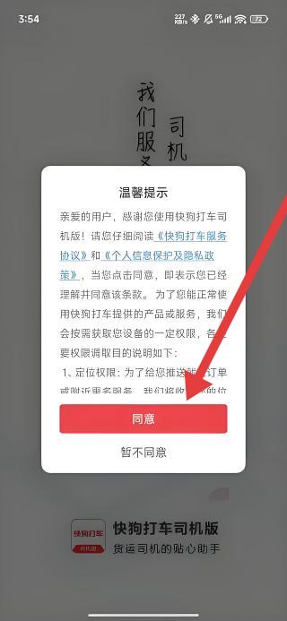 1、在快狗打車司機(jī)版溫馨提示彈窗中,通過點(diǎn)擊同意按鈕,接受服務(wù)協(xié)議與隱私政策,進(jìn)入應(yīng)用流程。