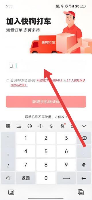 3、在加入快狗打車頁面,輸入手機(jī)號后,勾選協(xié)議后點(diǎn)擊獲取手機(jī)驗(yàn)證碼,推進(jìn)注冊登錄步驟。