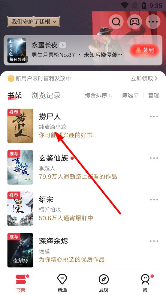 1、打開起點(diǎn)讀書APP,進(jìn)入書架頁面,找到想閱讀的書籍如示例中撈尸人,點(diǎn)擊書籍封面或標(biāo)題進(jìn)入書籍閱讀相關(guān)界面。