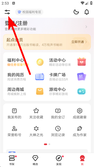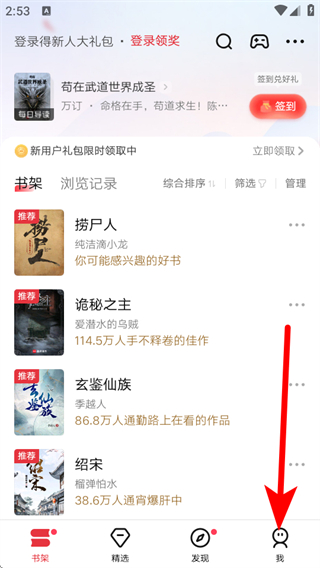 1、在起點(diǎn)讀書首頁,點(diǎn)擊右下角我選項(xiàng),進(jìn)入個(gè)人界面。
