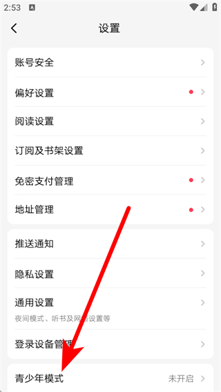 3、在設(shè)置頁面,點(diǎn)擊青少年模式選項(xiàng),進(jìn)入青少年模式設(shè)置界面即可開啟。