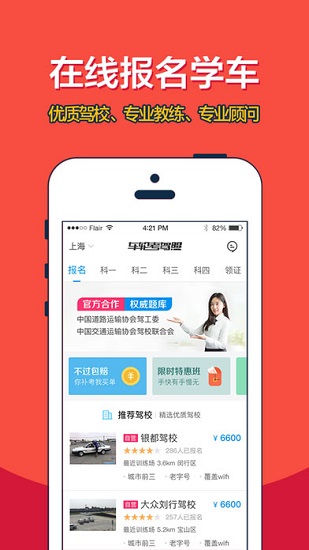 1、流程全面:覆蓋考駕照整個(gè)流程,報(bào)名->科目一->科目二->科目三->科目四->領(lǐng)駕照->新手上路