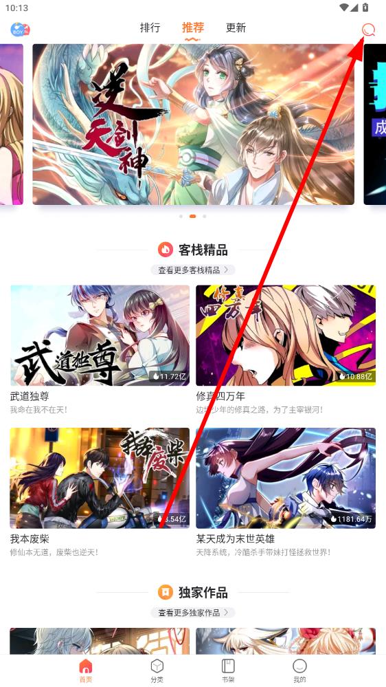 1、打開(kāi)漫客棧app,在推薦頁(yè)面點(diǎn)擊右上角搜索圖標(biāo)。