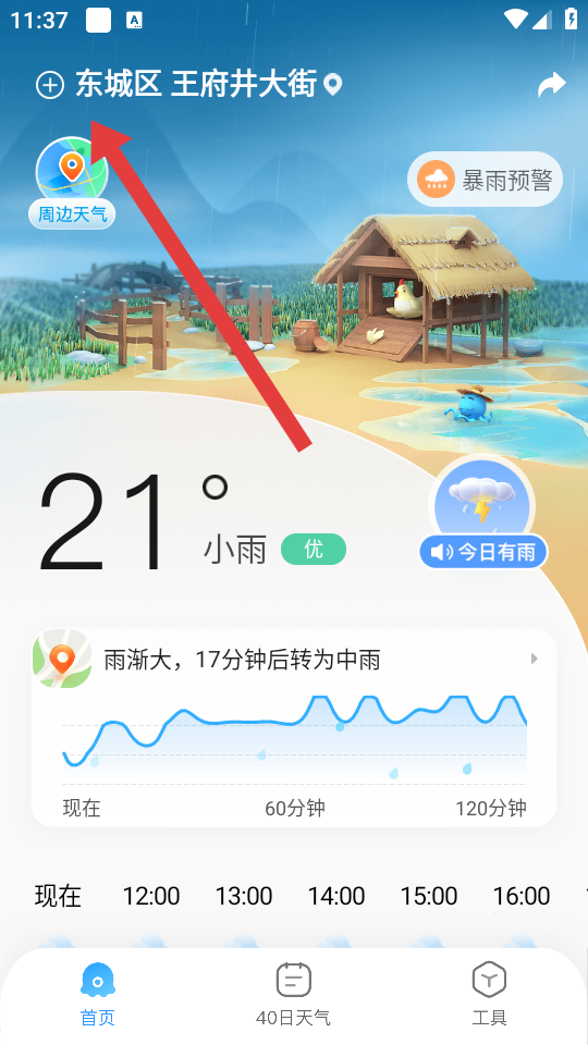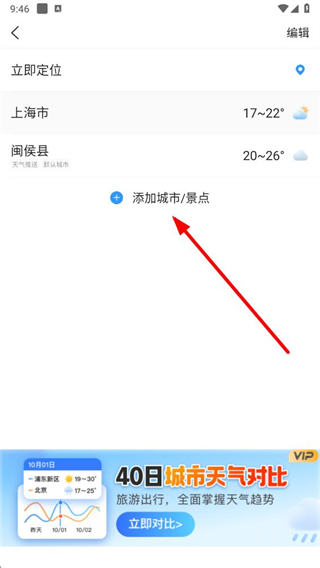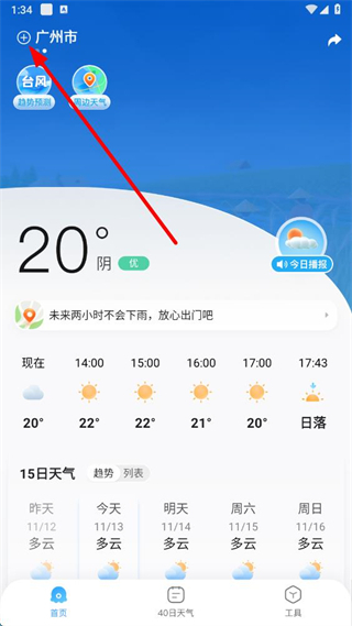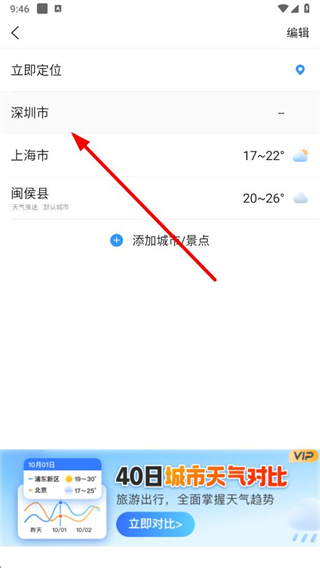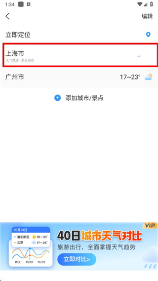 1、在2345天氣王app首頁點擊左上角城市名稱區(qū)域,進(jìn)入城市管理頁面。
