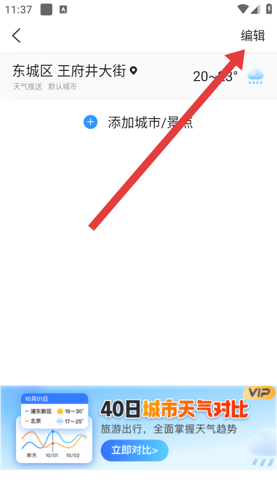 2、在城市管理的頁面,需要點擊右上角的編輯按鈕,進(jìn)入城市刪除編輯的模式。
