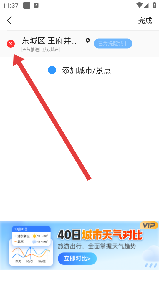 3、找到需要刪除的城市卡片,點擊卡片左側(cè)的紅色×的圖標(biāo),即可將該城市從選定列表中刪除。