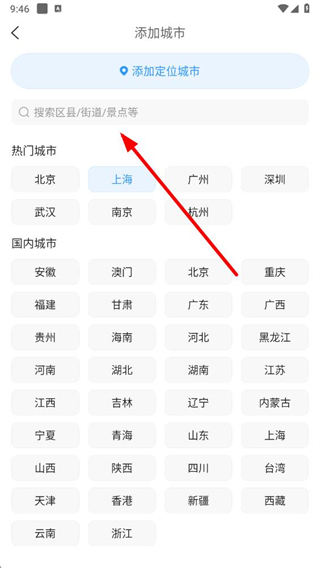 3、在添加城市頁面的搜索框中輸入城市名稱,或在熱門城市、國內(nèi)城市列表中選擇想要添加的城市。