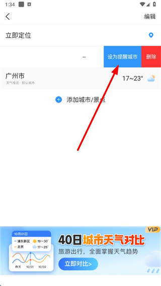 3、在彈出的選項中點擊設(shè)為提醒城市選項,即可完成城市提醒設(shè)置。