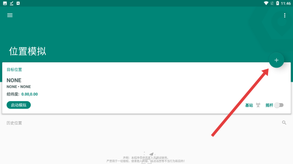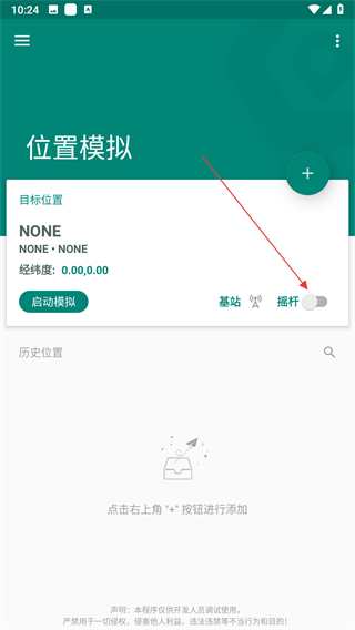1、打開Fake Location應用,在位置模擬頁面點擊搖桿開關。