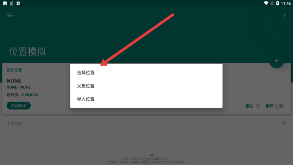 2、在彈出的菜單中,按照箭頭指示通過點擊選擇位置選項,進入地圖交互界面,為選取目標位置做準備。
