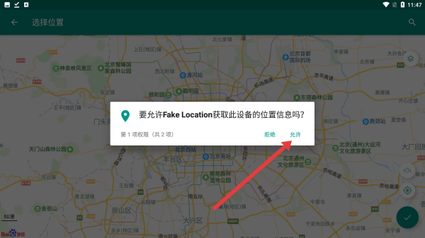 3、當FakeLocation請求位置權限時,點擊允許按鈕,授權應用獲取設備位置信息后,添加當前位置。