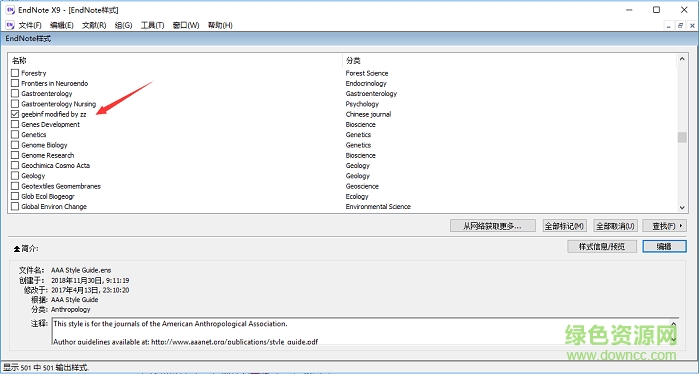 在對應(yīng)的樣式前打勾,勾選后關(guān)閉該對話框即可。如果太多了不好找,可以單擊下排最右端的按鈕“查找”然后選擇 Chinese journal。選擇使用geebinfmodified by zz樣式。