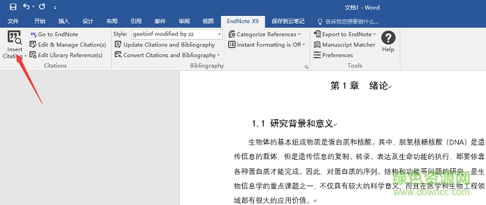 打開word,光標(biāo)定位在需要插入?yún)⒖嘉墨I的地方。打開EndNote x9選項,點擊Insert Citation圖標(biāo),如圖所示。