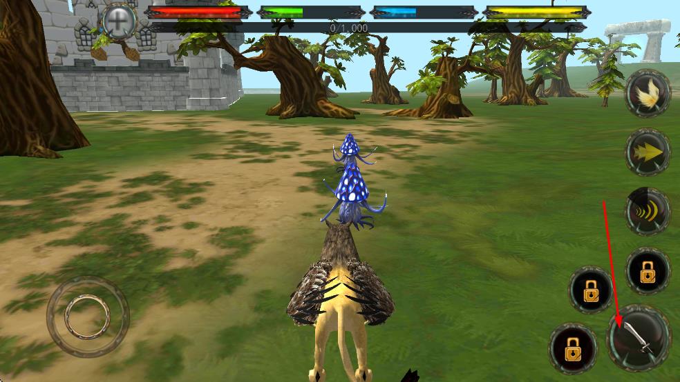 3、到達城堡附近后,發(fā)現(xiàn)藍色帶白點的敵人,點擊右側的武器圖標,讓獅鷲使用武器攻擊敵人,展開戰(zhàn)斗,嘗試擊敗敵人。