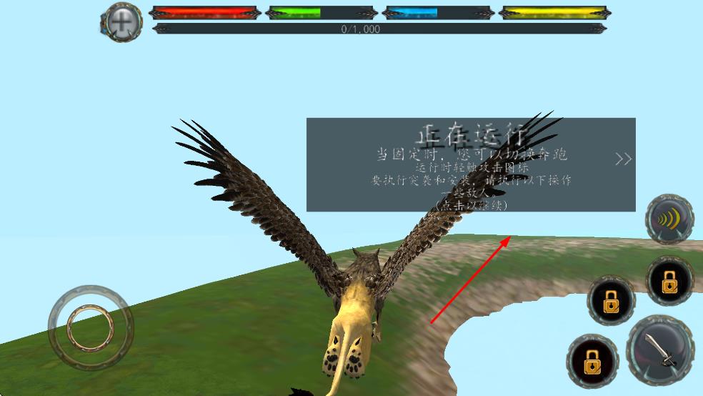 1、進入游戲后,看到“正在運行”的提示框,點擊提示框以繼續(xù),此時可操控獅鷲類生物開始行動,準備探索游戲世界。