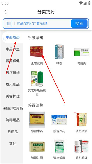 2、在分類找藥頁面,選擇藥品分類,再選擇具體病癥類別。