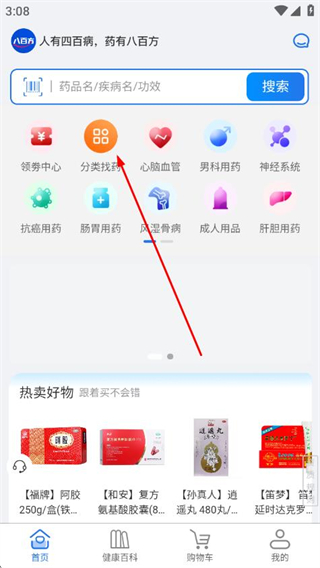 1、打開八百方健康商城APP,點(diǎn)擊首頁的分類找藥。