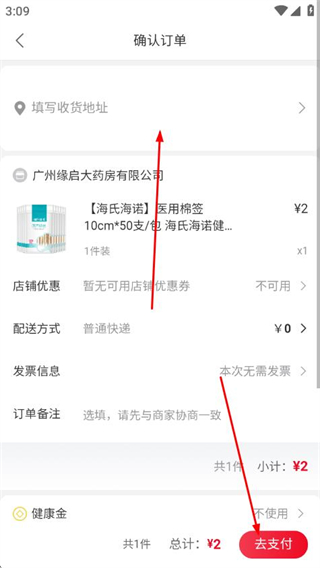 6、進(jìn)入確認(rèn)訂單頁面,填寫收貨地址,點(diǎn)擊去支付完成購買流程。