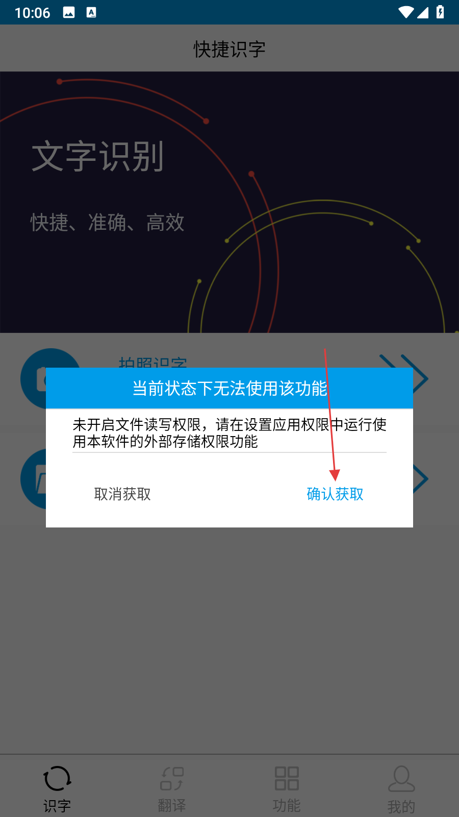 2、若彈出未開啟文件讀寫權(quán)限的提示框,點(diǎn)擊確認(rèn)獲取按鈕,前往設(shè)置開啟應(yīng)用的外部存儲(chǔ)權(quán)限。