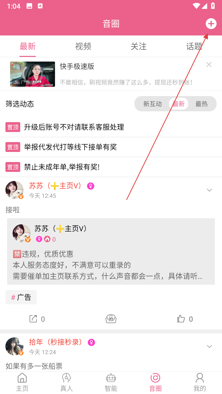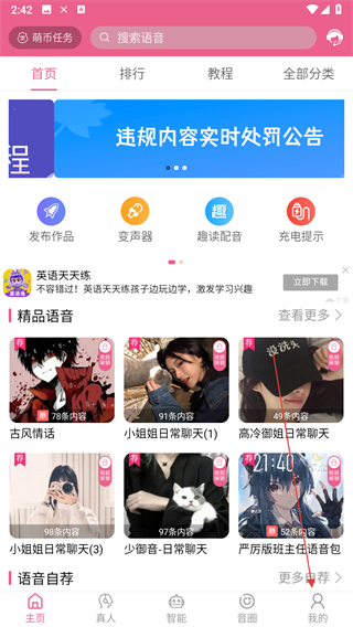 1、打開萌配音應用,進入底部導航欄中的音圈頁面,點擊該頁面右上角的+的圖標。