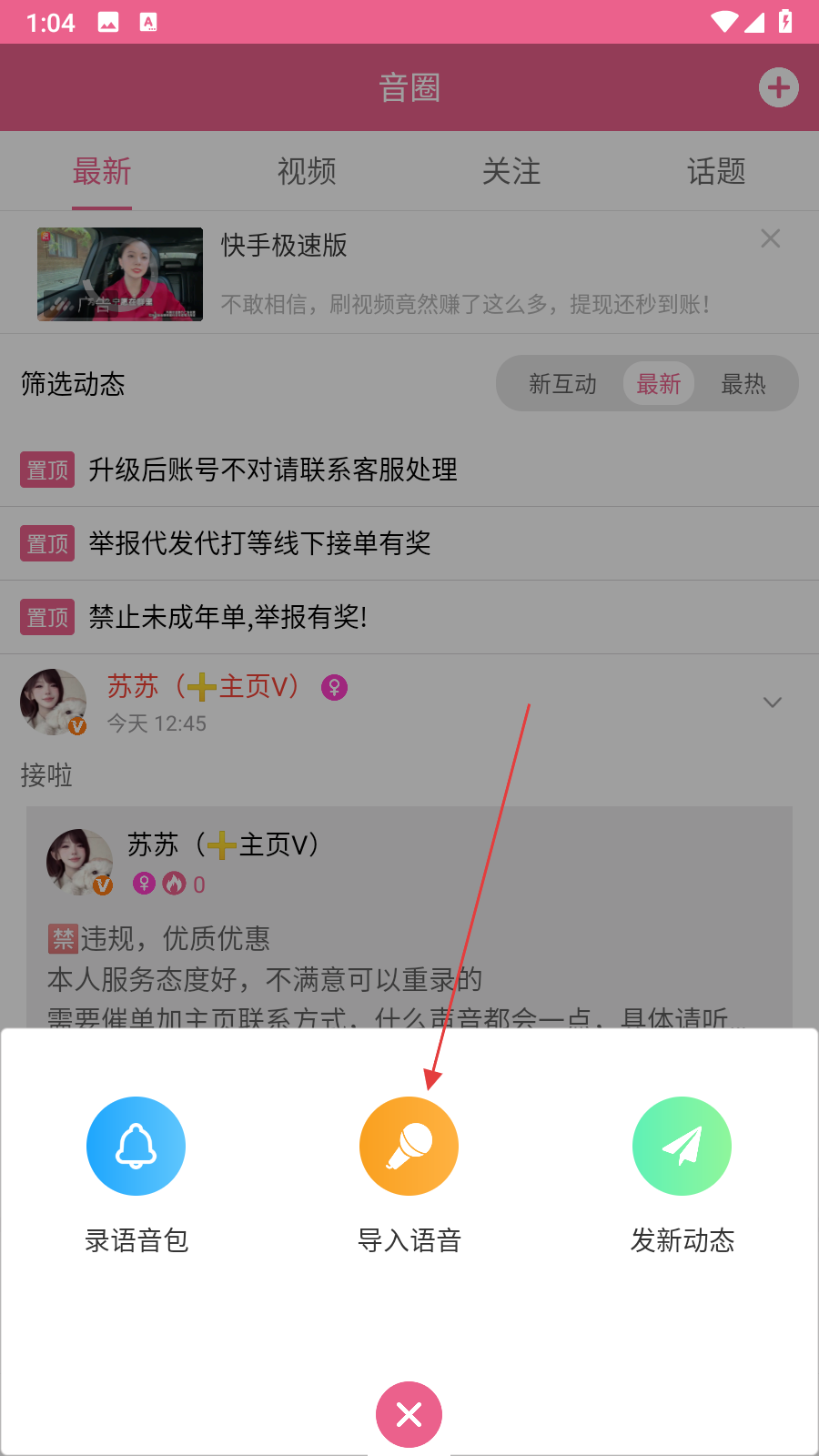 2、點擊+號后,會彈出一個操作選擇框,在其中找到并點擊導入語音選項。
