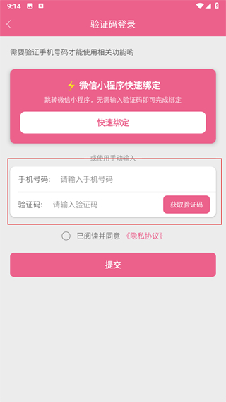 4、輸入手機號碼,點擊獲取驗證碼后填寫收到的驗證碼,點擊提交按鈕完成登錄。