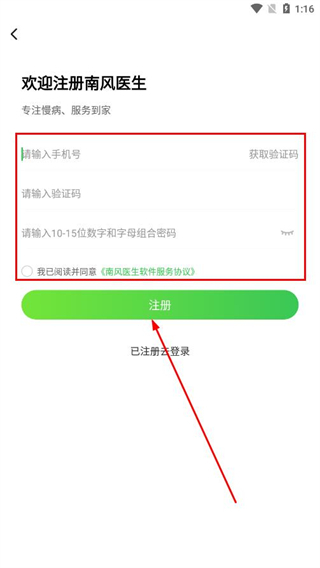 3、在注冊頁面,輸入手機(jī)號,填入驗(yàn)證碼,設(shè)置密碼。勾選協(xié)議,點(diǎn)擊注冊。