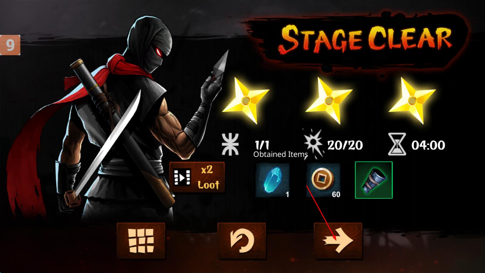 3、成功抵達(dá)大鼓并完成關(guān)卡任務(wù)后,進(jìn)入結(jié)算界面,點(diǎn)擊繼續(xù)箭頭,可獲取獎(jiǎng)勵(lì),開啟下一段忍者武士的冒險(xiǎn)征程。