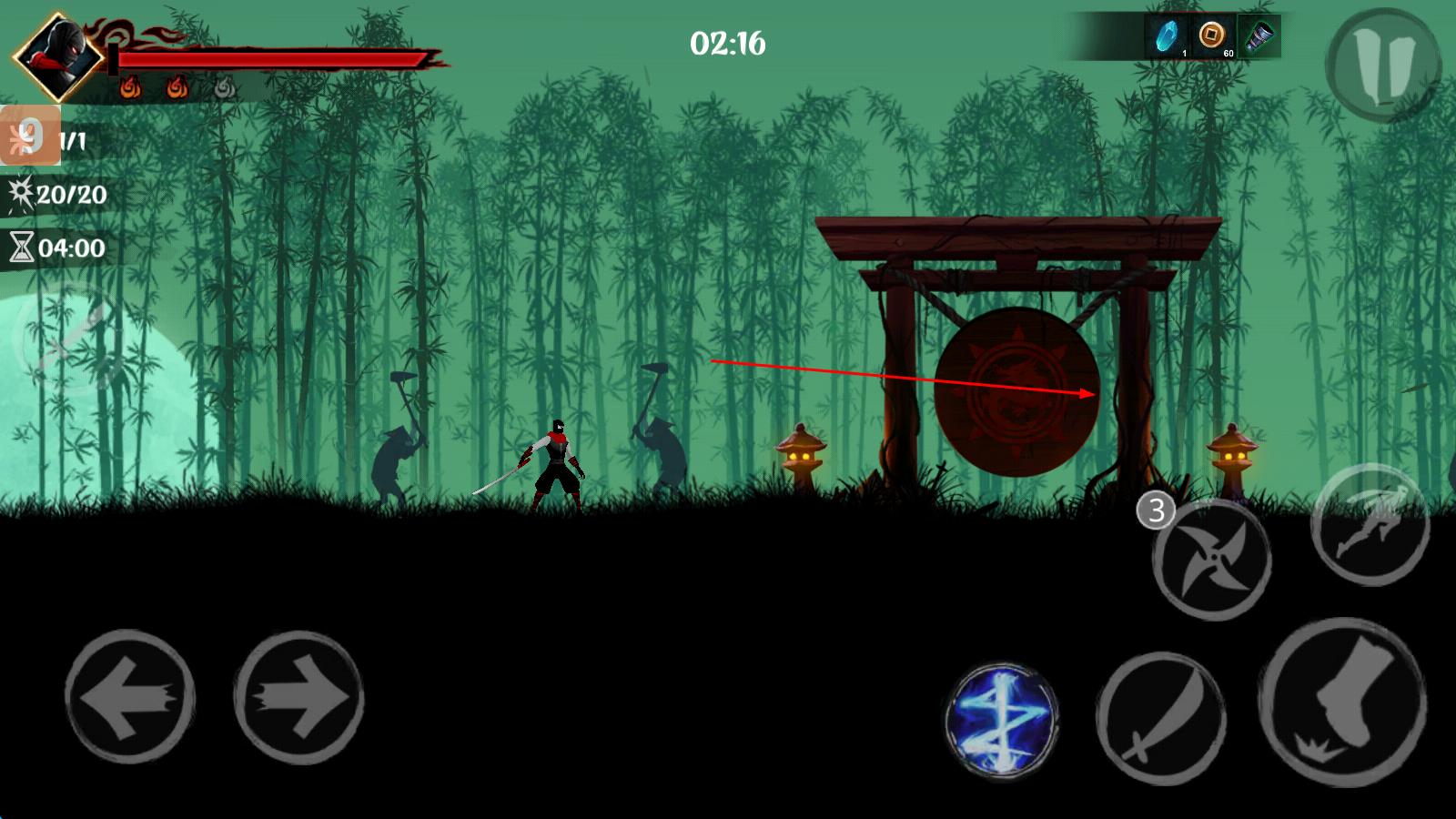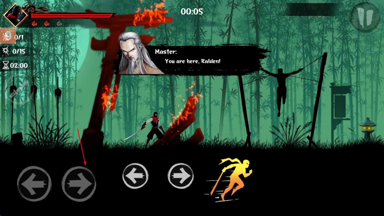 1、操控忍者武士移動(dòng),利用左右方向鍵調(diào)整位置,接近敵人或目標(biāo)區(qū)域,留意場(chǎng)景障礙與敵人動(dòng)向,按沖刺鍵可快速突進(jìn),靈活走位應(yīng)對(duì)挑戰(zhàn)。