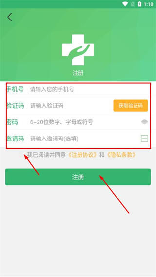 3、輸入手機號,填入驗證碼,設置密碼,邀請碼選填,勾選協(xié)議,點擊注冊。