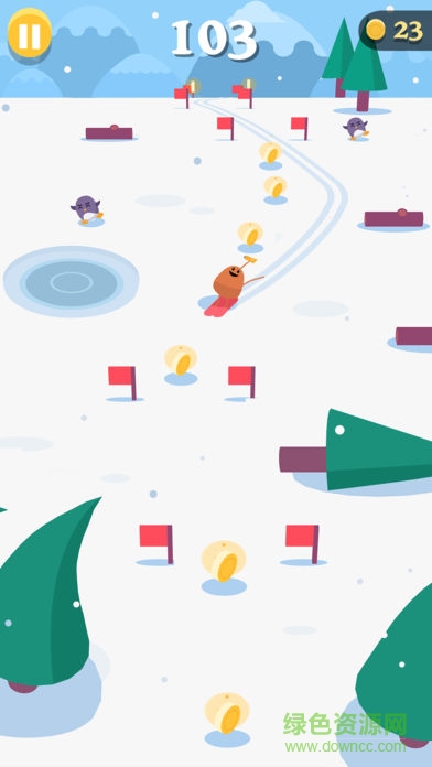 點(diǎn)擊左右移動,點(diǎn)擊并按住可更快的滑雪,標(biāo)志之間滑雪獲得獎勵積分!