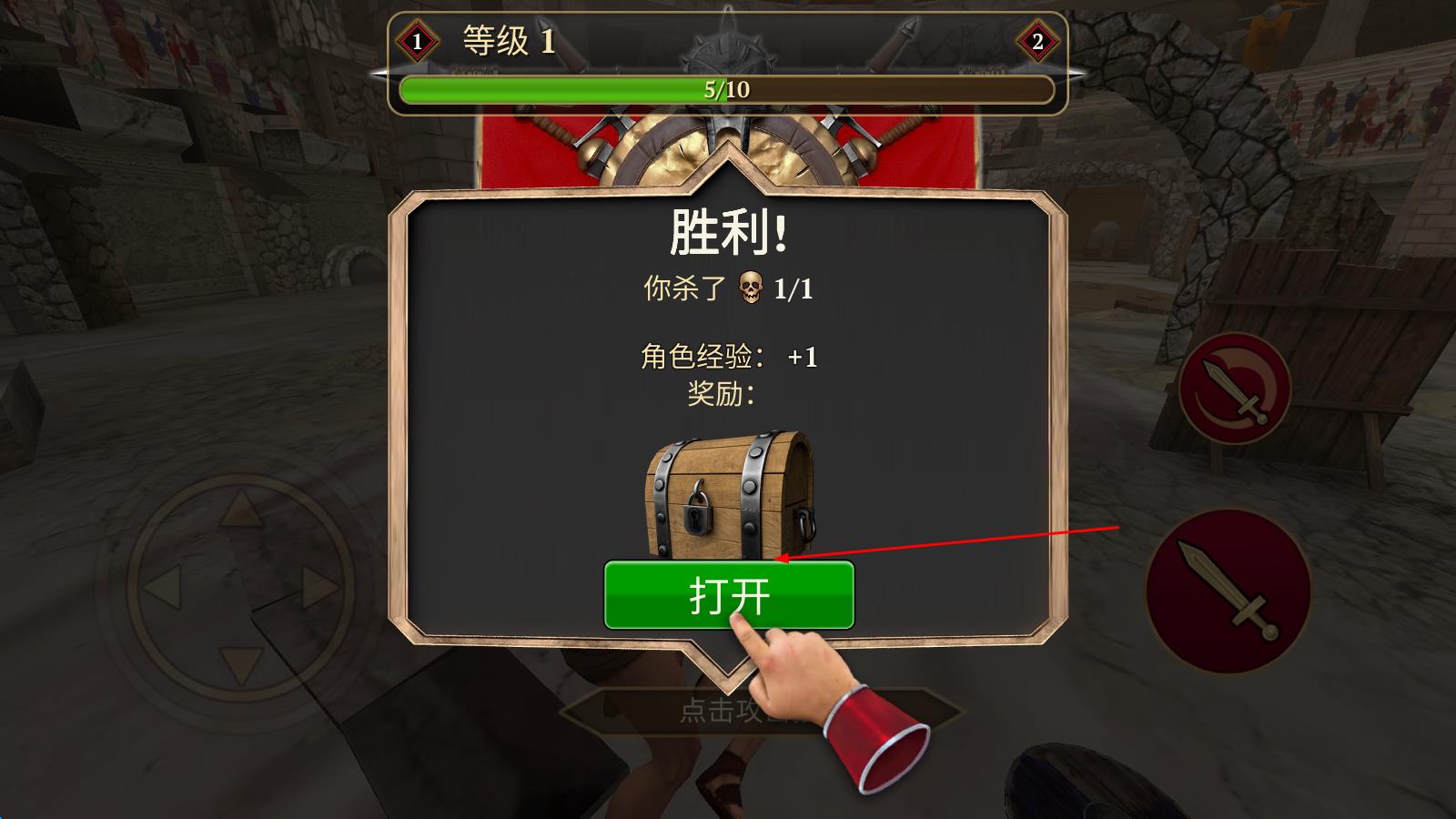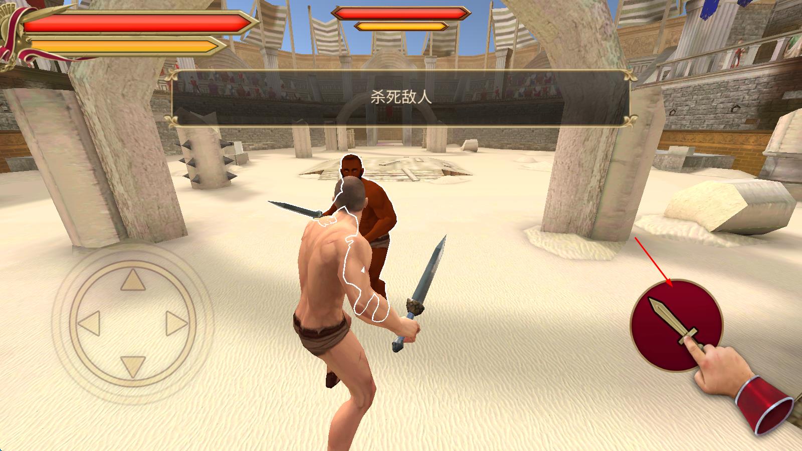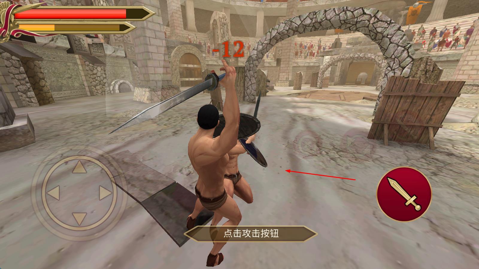 1、初入游戲,玩家操控角斗士站在競技場入口,通過屏幕左側搖桿靈活移動,躲避對手攻擊,點擊右側按鈕即可揮出初次攻擊,正式開啟戰(zhàn)斗。
