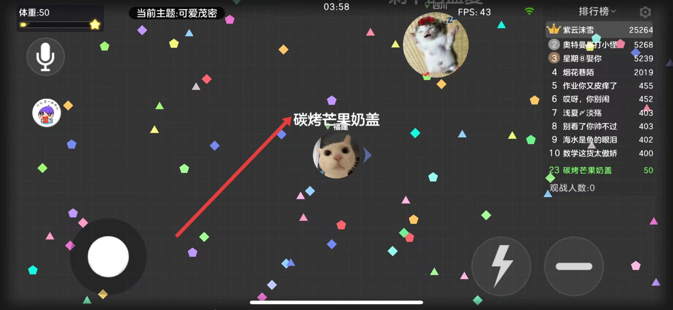3、不斷吞噬地圖上的彩色方塊和其他小球來(lái)增大自身體積,利用吐球、分身等技巧,努力讓自己的球球在規(guī)定時(shí)間內(nèi)達(dá)到更大尺寸以實(shí)現(xiàn)霸屏。