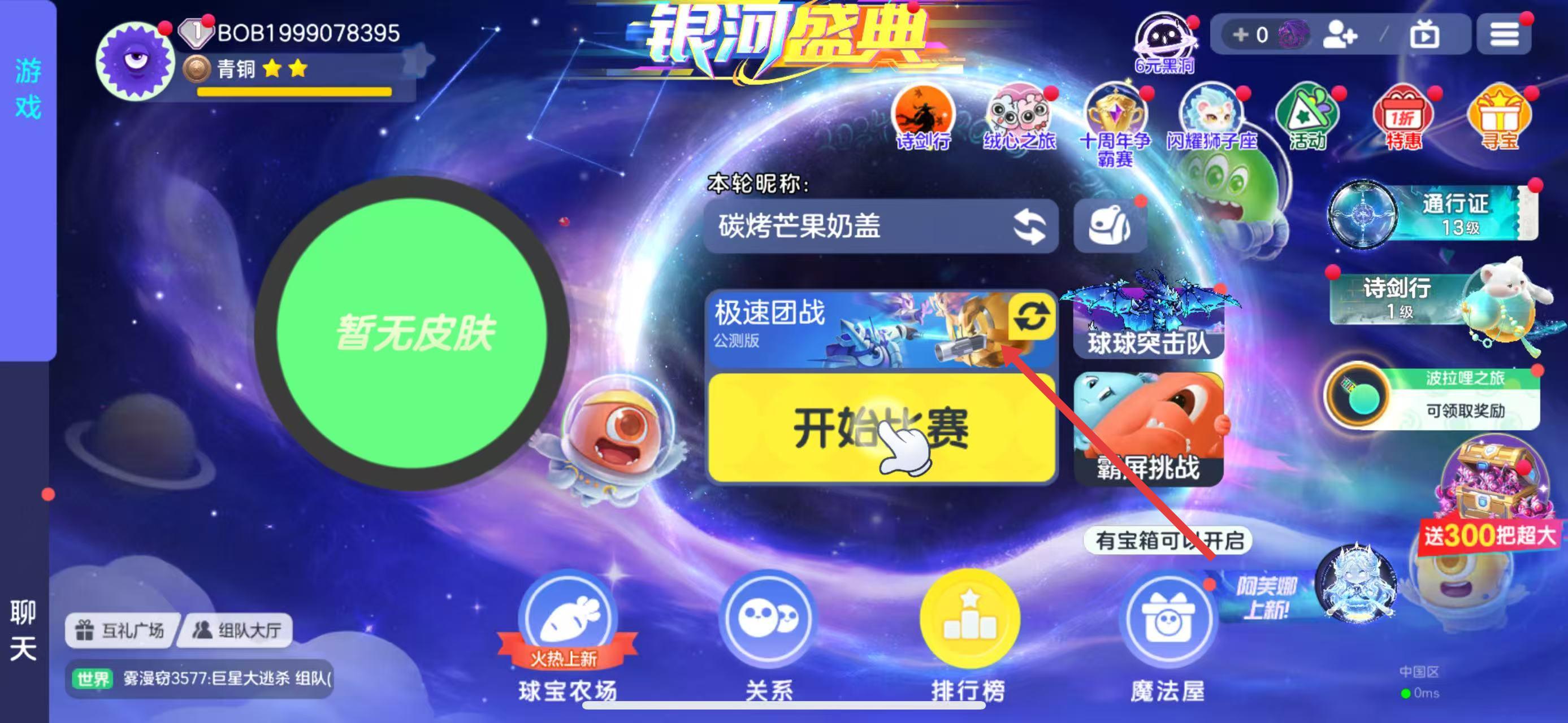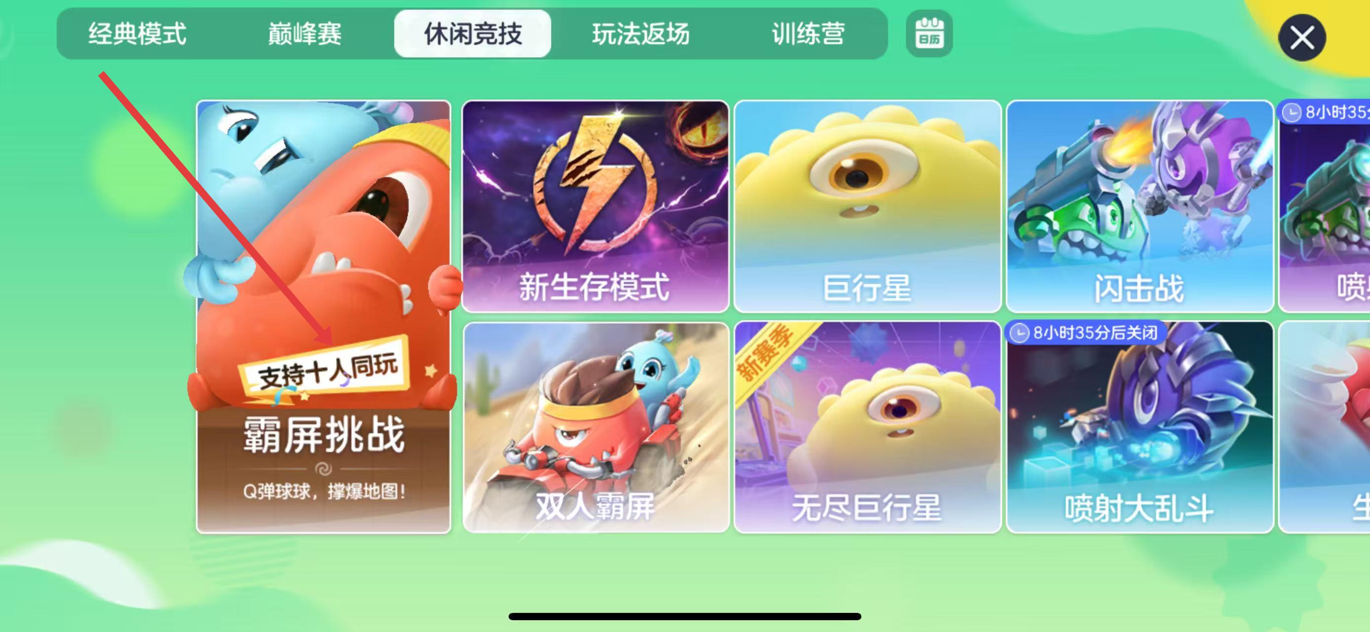 1、打開(kāi)球球大作戰(zhàn)進(jìn)入主界面,點(diǎn)擊極速團(tuán)戰(zhàn)旁切換按鈕,選擇休閑競(jìng)技,找到霸屏挑戰(zhàn)模式進(jìn)入。
