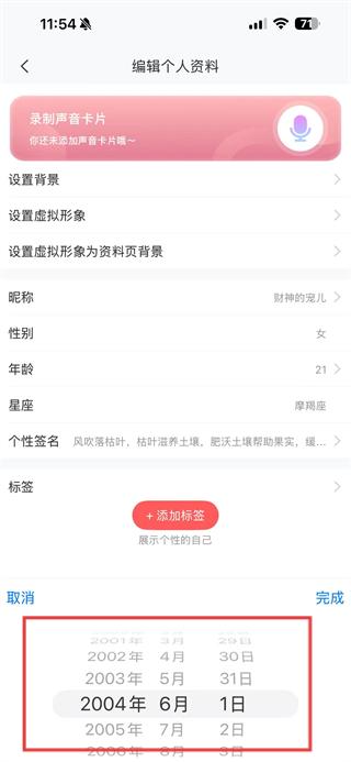 4、在編輯頁(yè)面中選擇想要設(shè)置的年齡后,點(diǎn)擊完成按鈕,即可完成年齡修改。