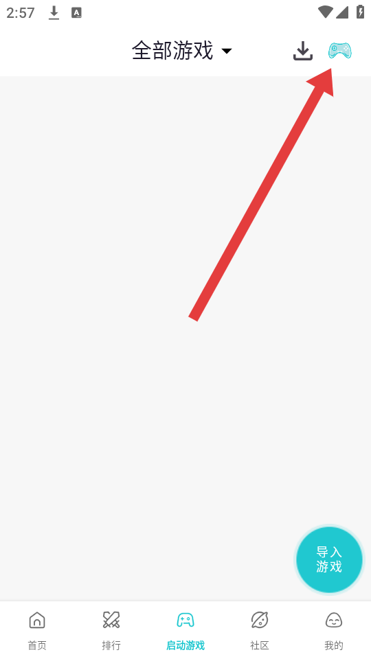 1、打開(kāi)小雞模擬器,進(jìn)入啟動(dòng)游戲的頁(yè)面,點(diǎn)擊右上角的藍(lán)色手柄圖標(biāo),進(jìn)入手柄連接界面。