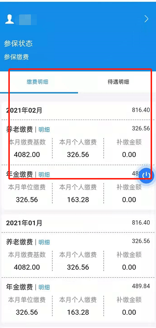 第三步:點(diǎn)開“參保繳費(fèi)”顯示本人“繳費(fèi)明細(xì)”和“待遇明細(xì)”
