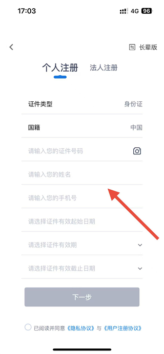 4、在注冊(cè)頁面中,依次在輸入框填入信息,勾選同意后,點(diǎn)擊下一步,完成后續(xù)操作即可注冊(cè)賬號(hào)。