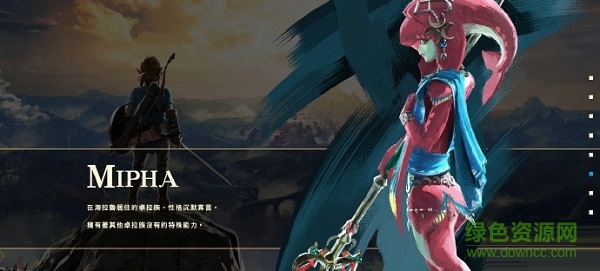 米琺(Mipha)海爾拉上索拉一族的成員,可以自如地在水中活動, 不太說話,善于思慮,就是說看起來挺高冷的。米琺還擁有其他族人所沒有的特別力量。
