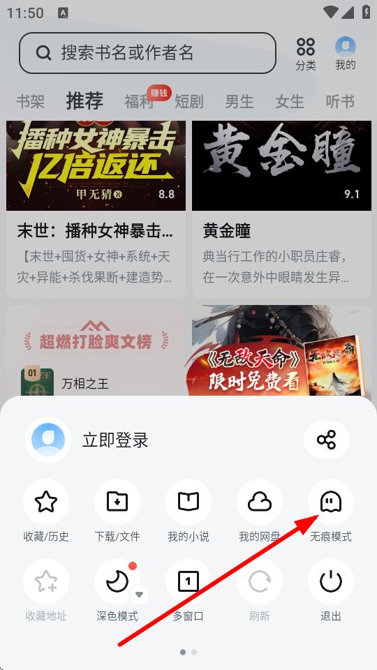 2、在彈出的菜單界面中,找到并點擊無痕模式圖標。